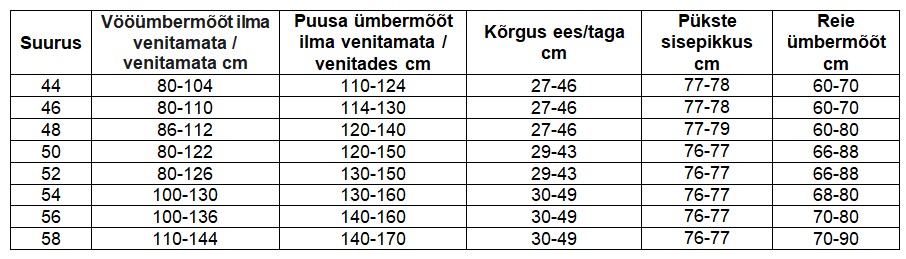 Suuruste tabel: